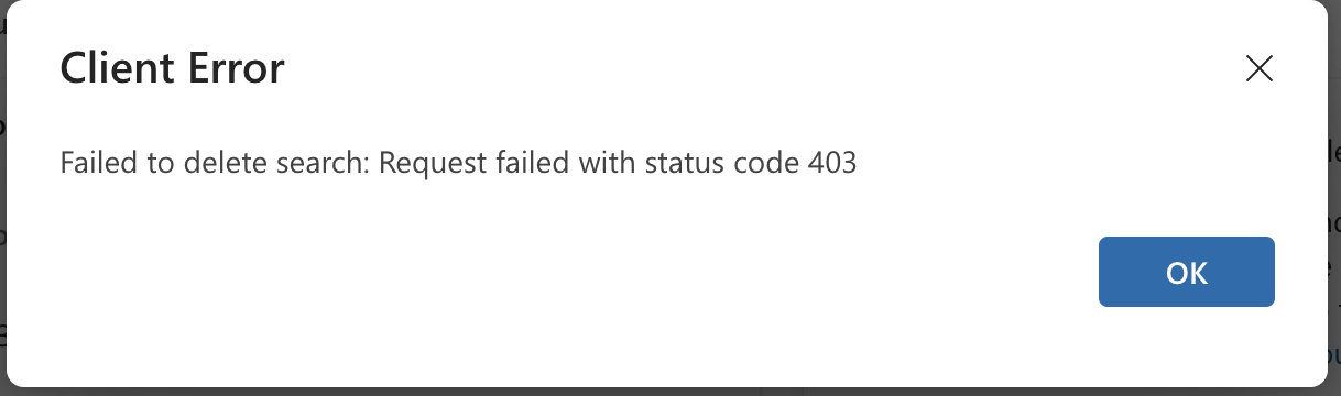 I decided to log in with a user who was an eDiscovery Manager instead of an Administrator, and sure enough, my attempt to delete a search was met with this 403 error.