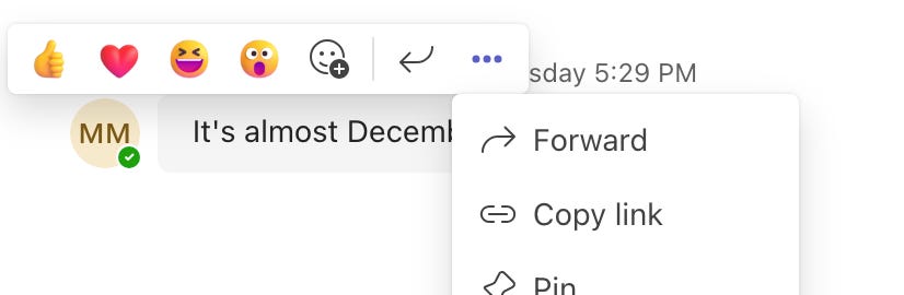 Let’s start with seeing the option in Teams. It’s available when looking at a chat message using the three dots.