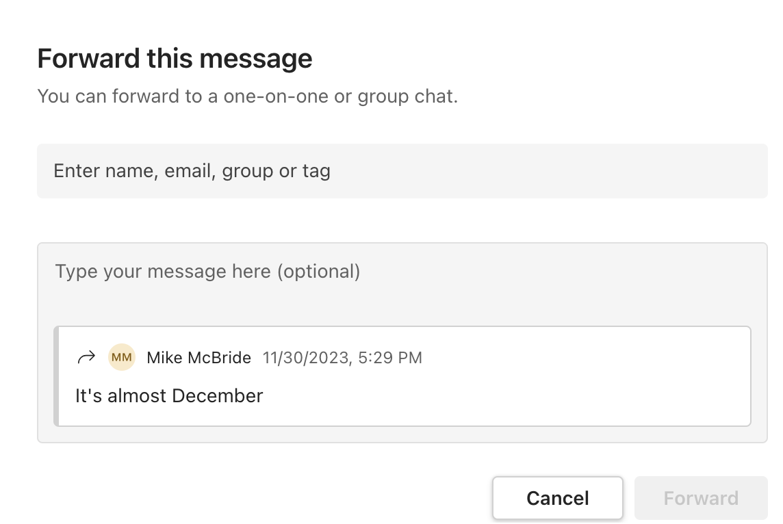 This will open a window where you can send the message to another user or group and add your own comment. (Note: The Forward feature is currently unavailable to the Teams web version and only available in the new Teams application.)