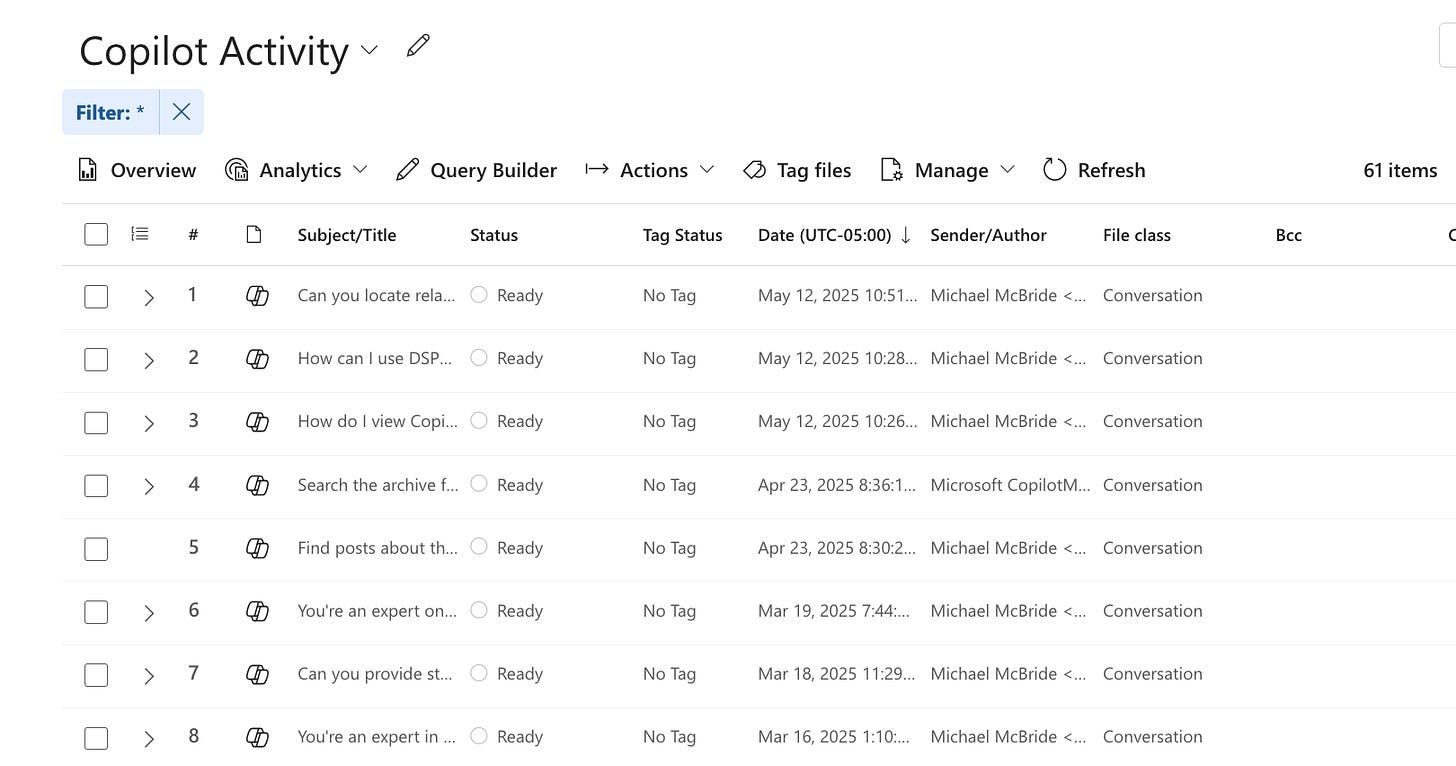 You see a screenshot from a review set that contains the results of searching for Copilot activity across my Admin mailbox in a Dev tenant. A tenant that can’t purchase Copilot licenses.