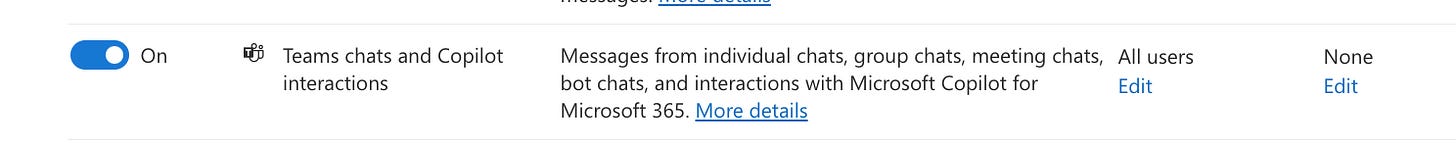 As I commented on her post, I first became aware of this when following some links to this Microsoft documentation, where I first realized that Purview Retention policies refer to “Teams chat and Copilot interactions” as one type of item when setting up a retention policy, as you see in the screenshot below: