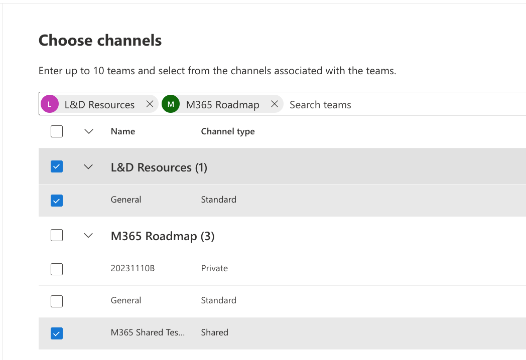 The screenshot above shows where I added the L&D Resources Team and the Shared Channel from my M365 Roadmap Team.