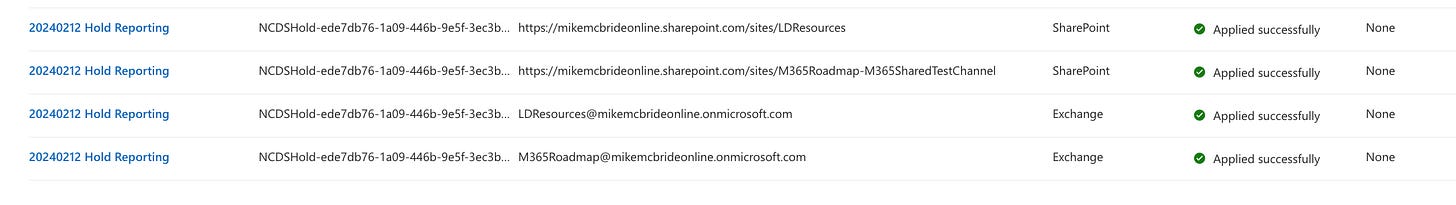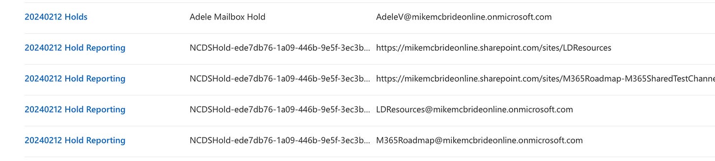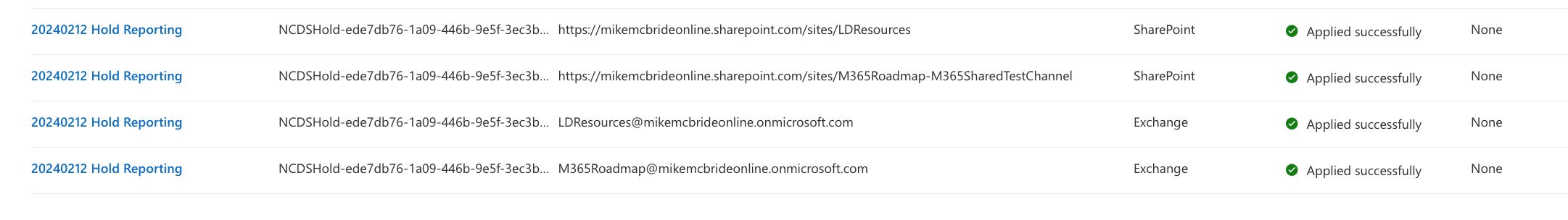 The obvious first step was to create a new case and place some holds. I recently cleared all of the existing holds in my tenant, so this would have to be all new stuff. That means the one test I couldn’t perform was determining if the report picked up previously existing holds. I assume it would, but if anyone knows for sure, please share.