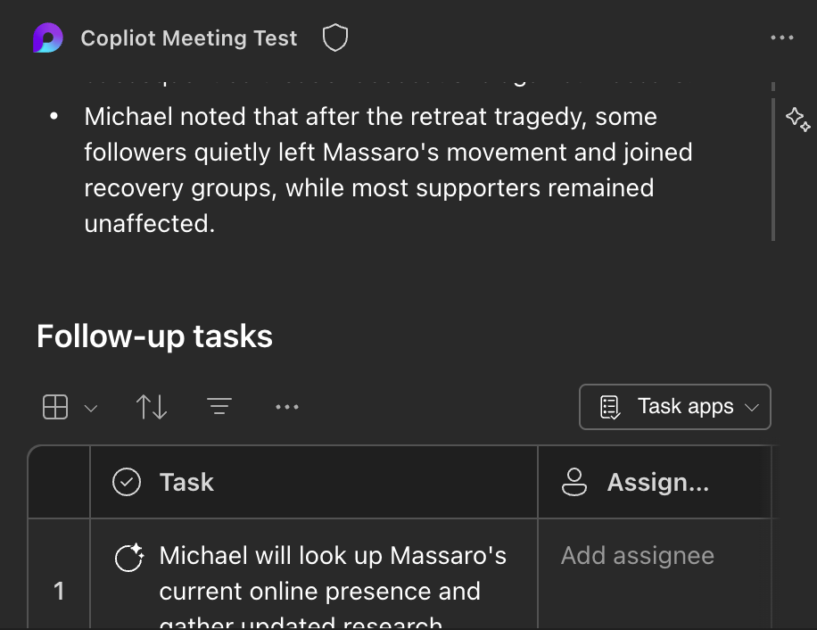 While it was creating tasks, it could not assign them. That is a Teams Premium feature, so I was not surprised that it was not able to do that without that license.