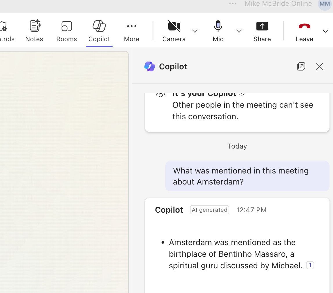 I first experimented with it in a test meeting, where I had the ebook I had been reading playing through one of the accounts, and watched as the agent took notes, answered questions for me about what had been said in the meeting, and created follow-up tasks based on my comments and chat messages.