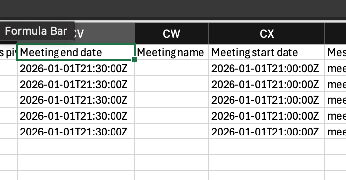 Two were directly from each user's calendar. Just the way they were previously. They each displayed the meeting start and end dates from the first date of the meeting, January 1.