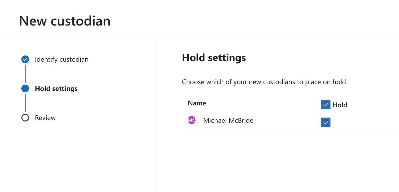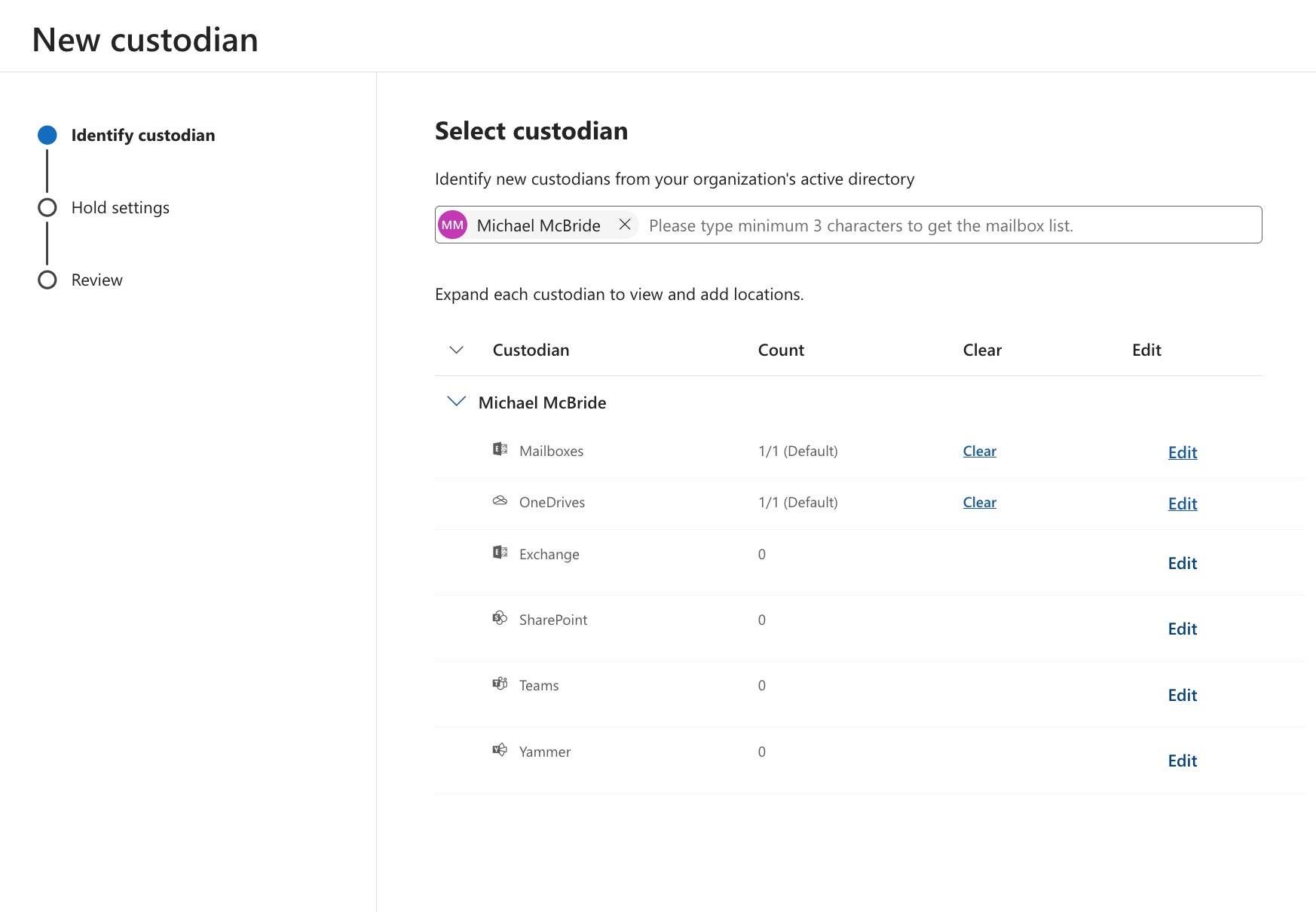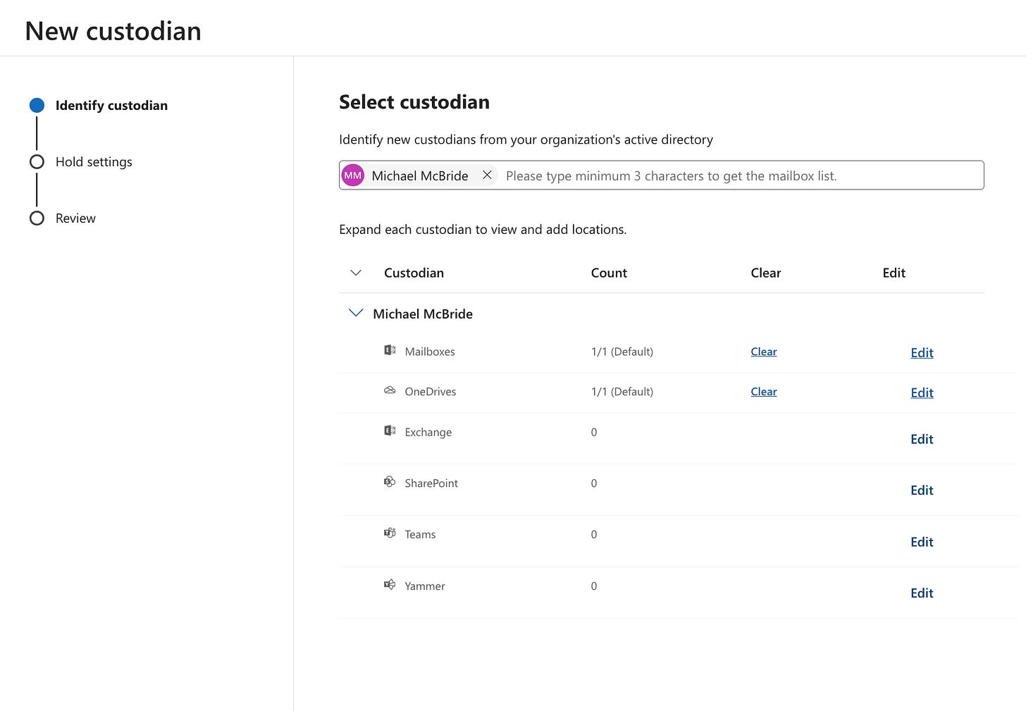 When adding a custodian source, you search for the user and can add or remove their mailbox, OneDrive, other mailboxes, SharePoint sites, and Teams or Yammer groups they had access to, and you could place the locations on hold on the next screen: