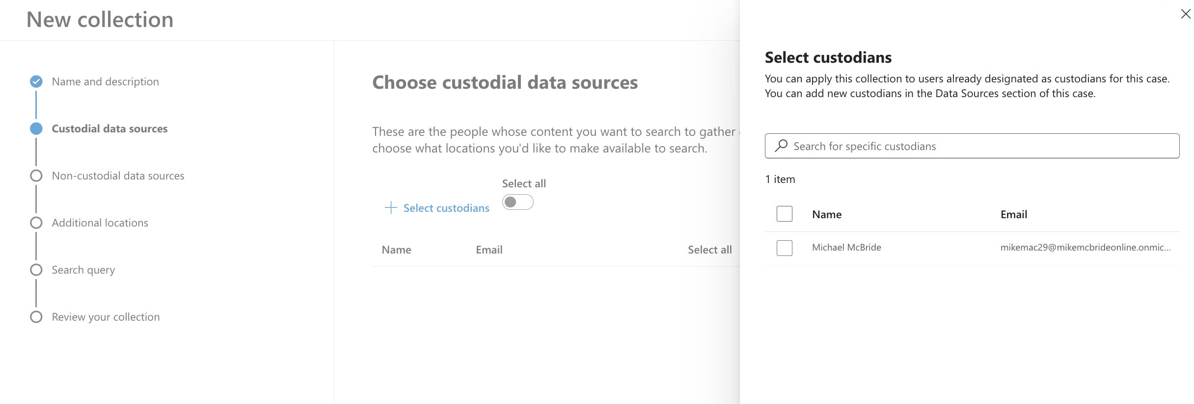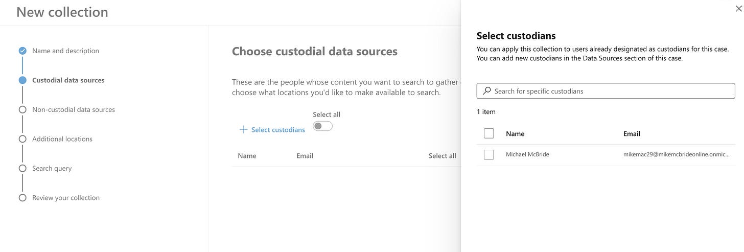 The workflow is also very different. In Classic, you set the locations where you want to assign Mike as the custodian, then search across them using the custodian data sources option in the collection wizard.