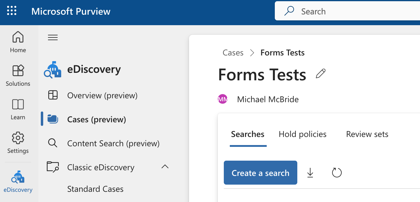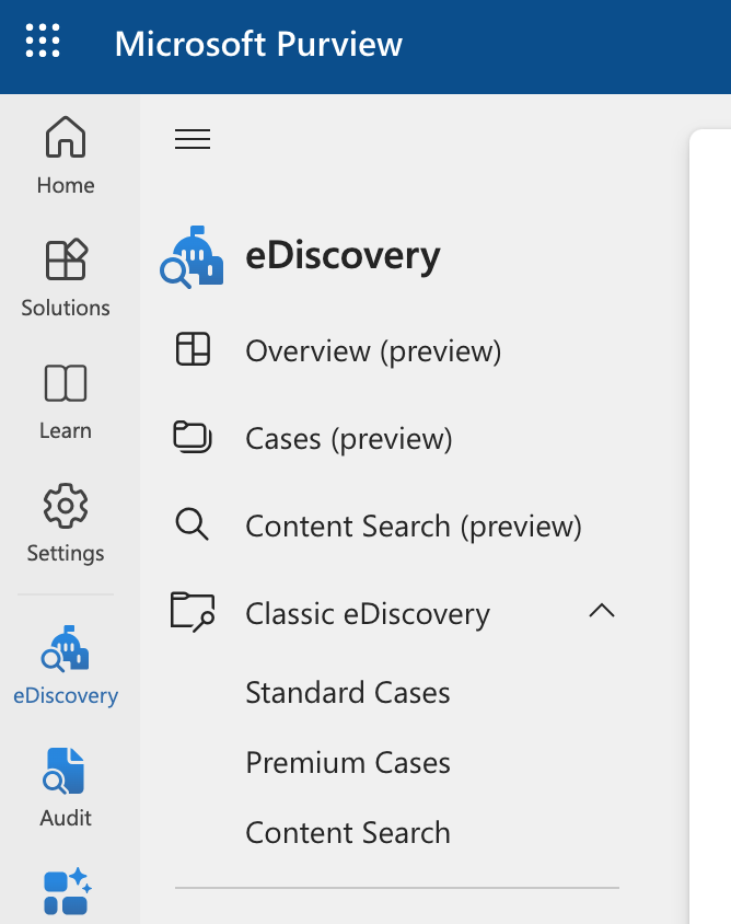 I also saw that the Purview eDiscovery preview was available. While this is not a full review, I naturally noticed one big missing feature. (There are more than one, trust me on this.)