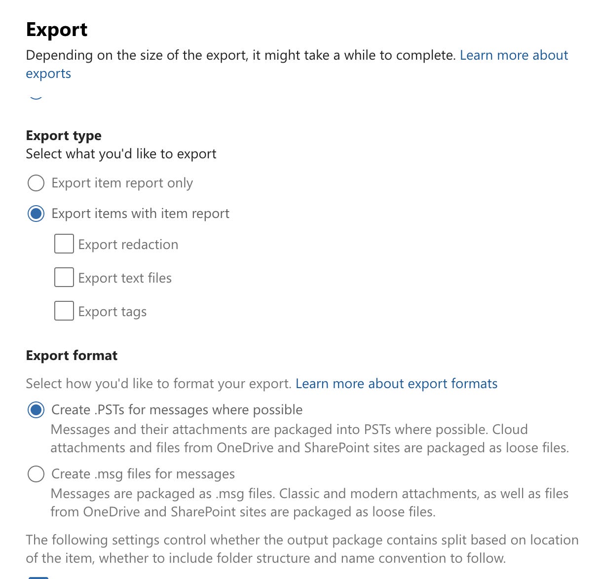 I immediately ruled out using the option to create PSTs. I know that an email exported into a PST would need to be processed by eDiscovery software and would not maintain any connection to an existing item that was exported from a OneDrive or SharePoint connection.